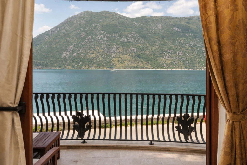 Large panoramic windows provide stunning views of the Bay of Kotor and mountains, filling the apartment with light and creating a cozy atmosphere.