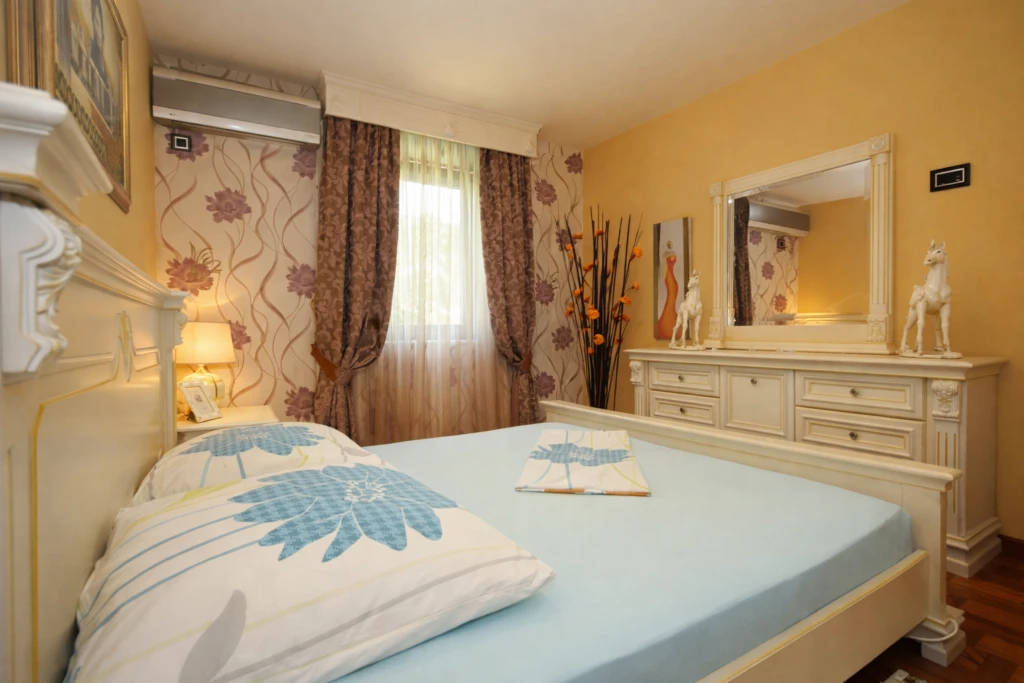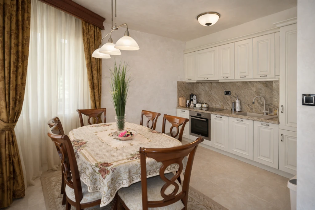 The house is fully ready for occupancy: all necessary furniture is installed, the kitchen is equipped with appliances, and all rooms have air conditioning and high-quality finishes.