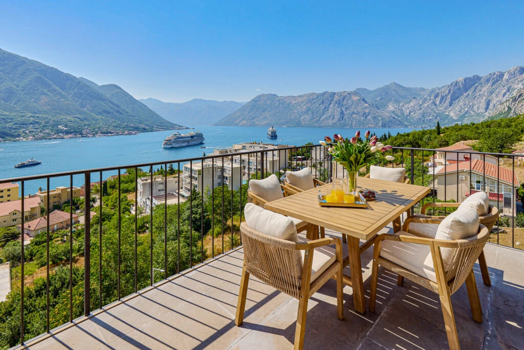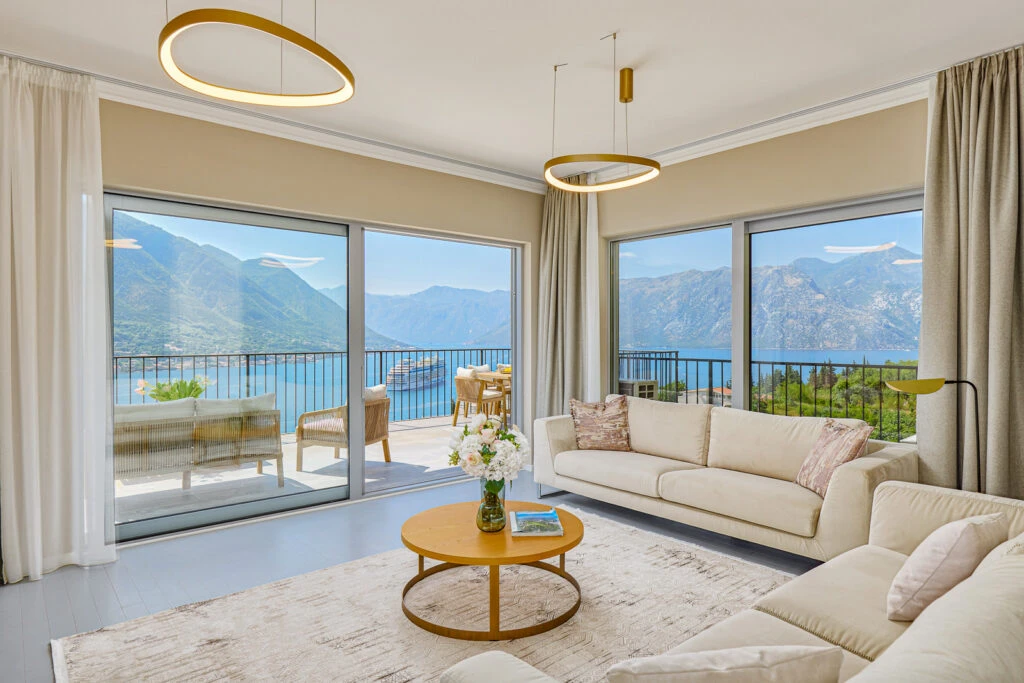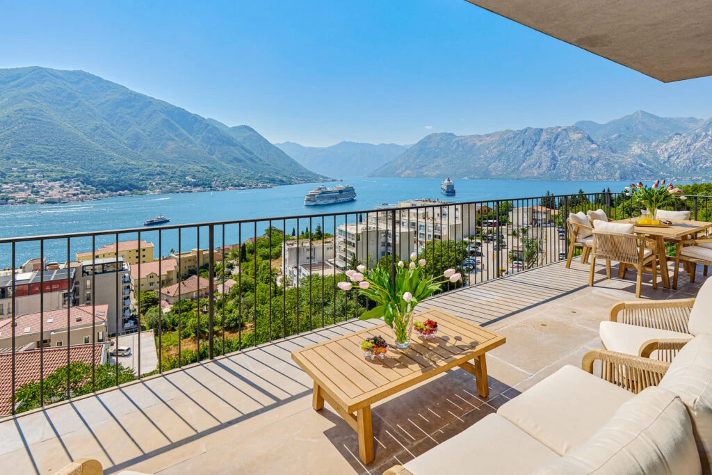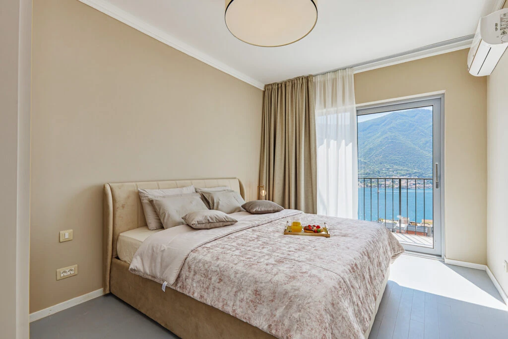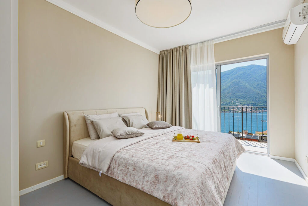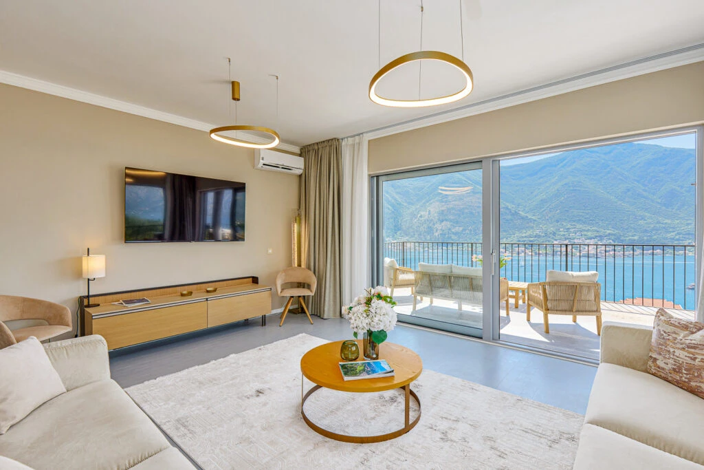 Panoramic apartment featuring breathtaking views of Kotor Bay from every room. Designer renovation with furniture from Italy and Germany, only 250m to the beach.