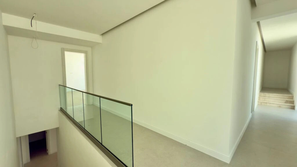 The layout includes a generous living room and two bedrooms on the ground floor, plus three more upstairs — all filled with natural light thanks to panoramic floor-to-ceiling windows offering truly breathtaking views of the sea and mountains.
