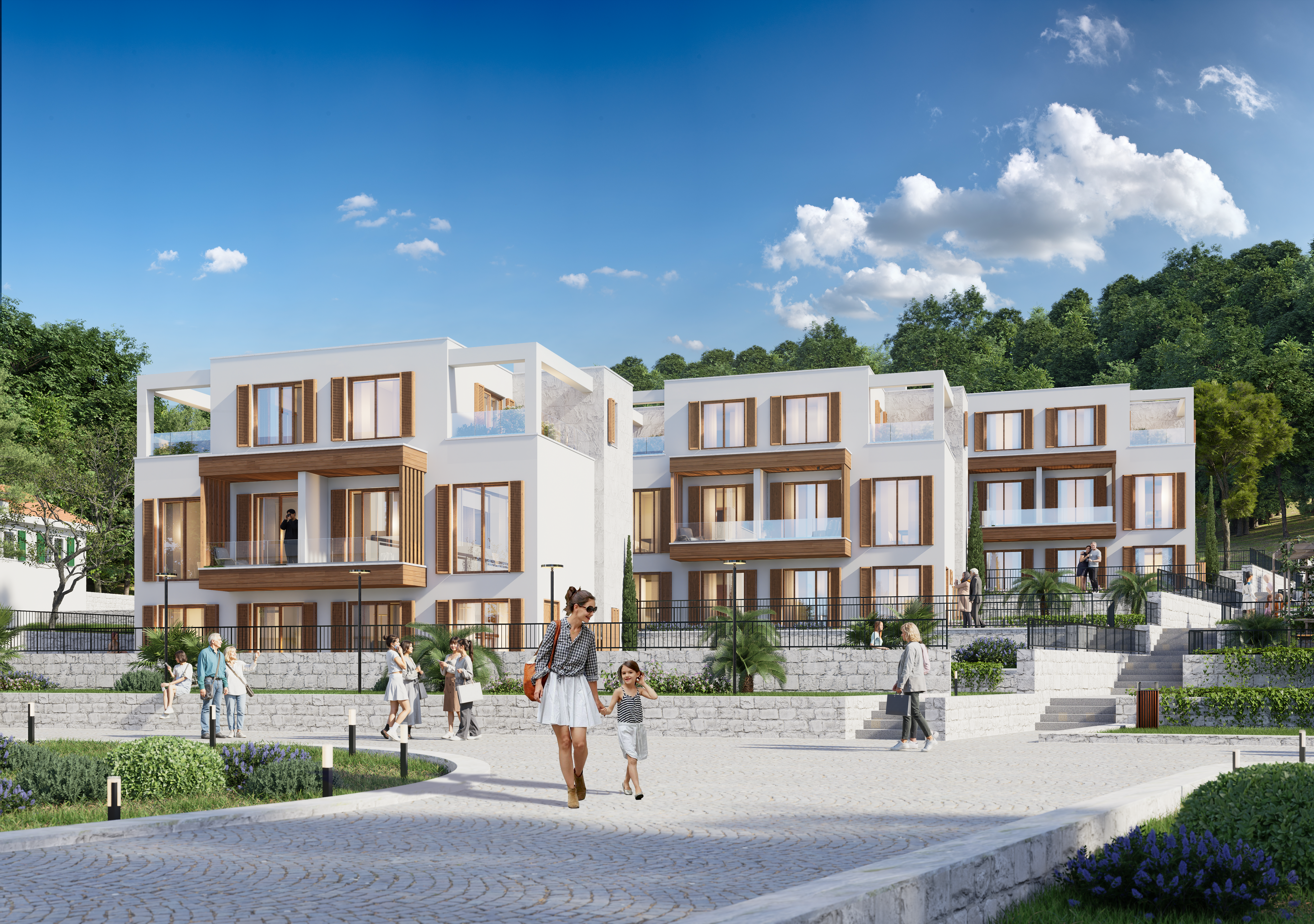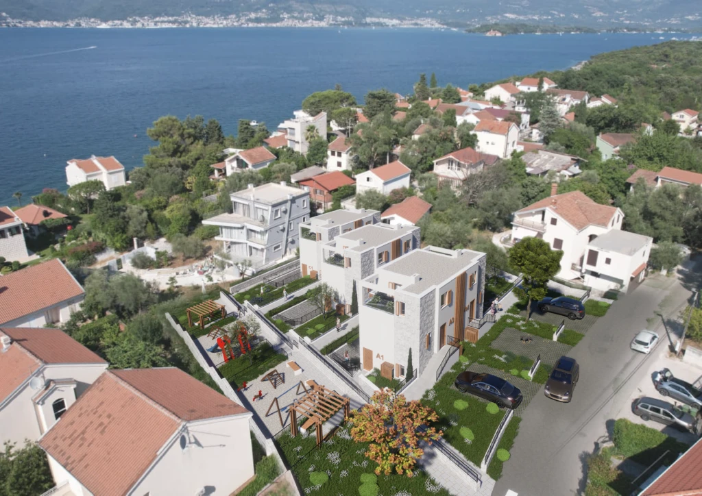 Небольшой жилой проект в Крашичах (Луштица, район Тивата): низкоэтажные здания в спокойном приморском окружении. Варианты планировок: 1–3 спальни, включая садовые дуплексы.