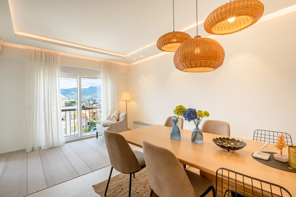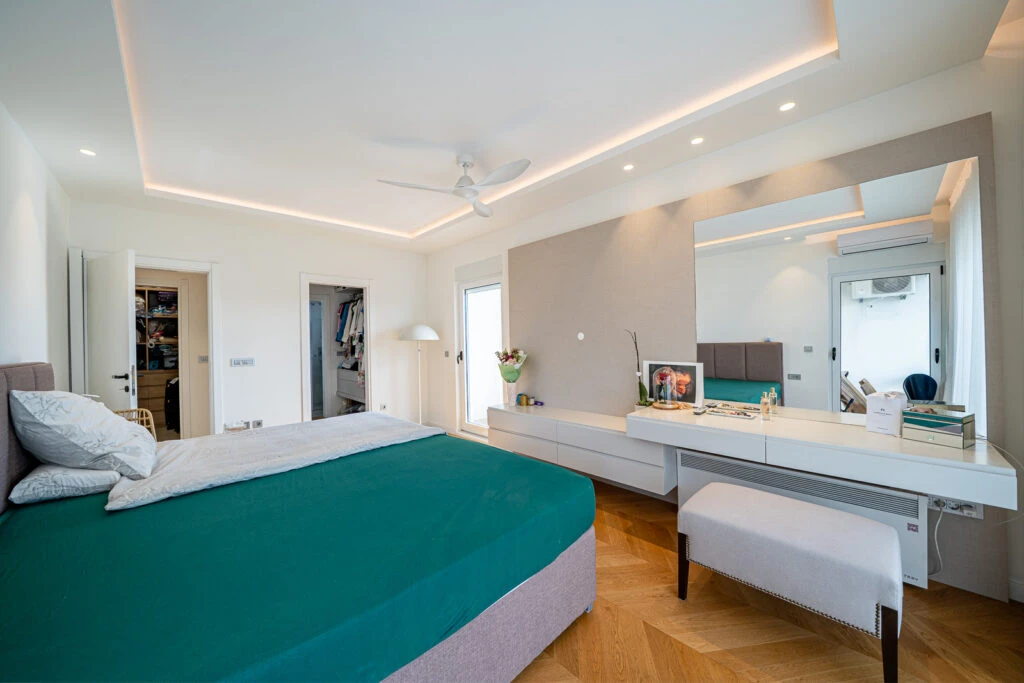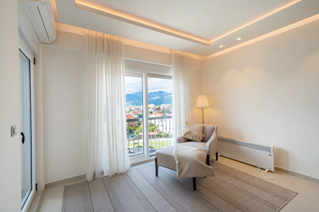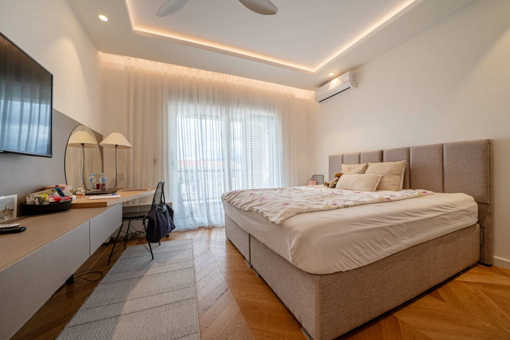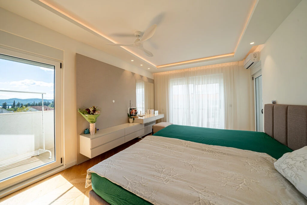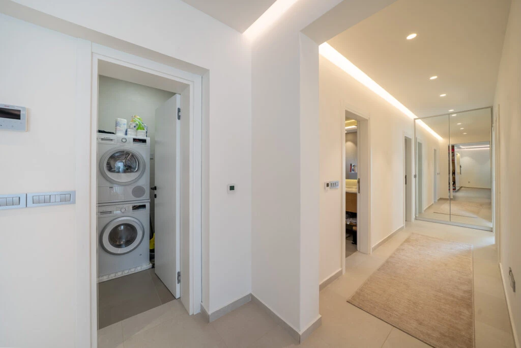 Просторная, полностью меблированная квартира с двумя спальнями в новом доме — в тихой зелёной части центрального Тивата. Гостиная с кухонной зоной в формате open-space выходит на террасу. Две большие спальни, две ванные комнаты, две гардеробные, просторный холл и отдельная постирочная/кладовая — отличный вариант для семьи.