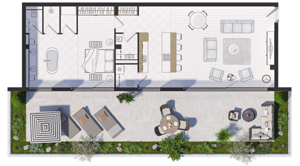 Prostran jednospratni apartman ukupne površine 157 m² (uključujući terasu i ostavu): dnevni boravak sa kuhinjom, jedna spavaća soba, dva kupatila i posebna tehnička prostorija (mašina za veš, bojleri).